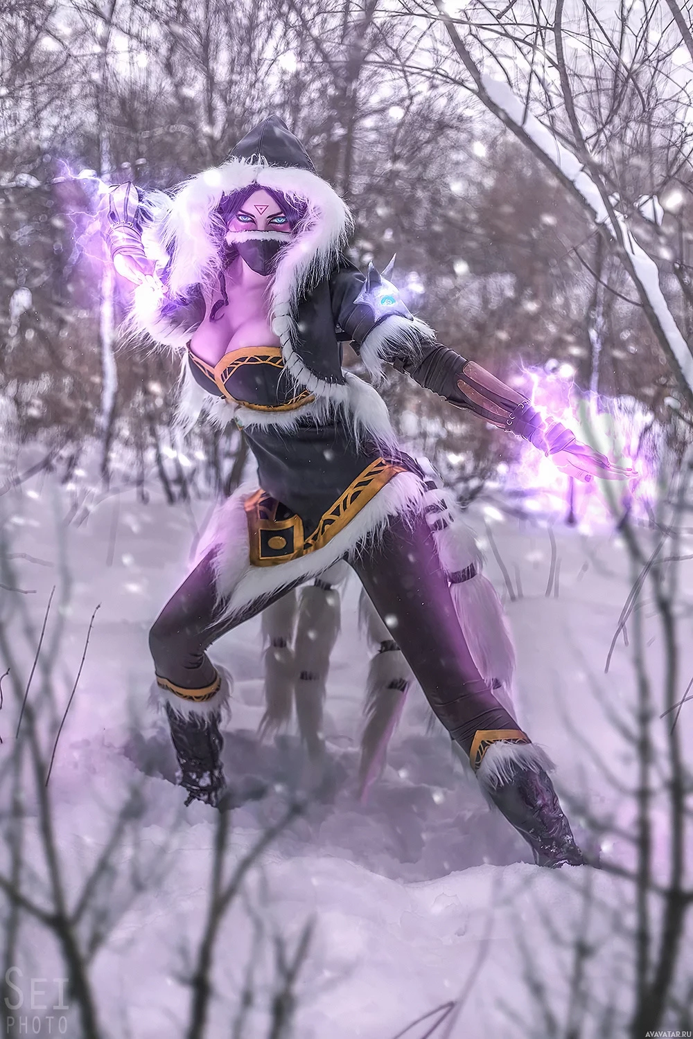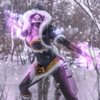 a character from the game "Dota 2" who is cosplaying as Templar Assassin. The character is standing in a snowy,