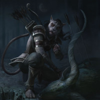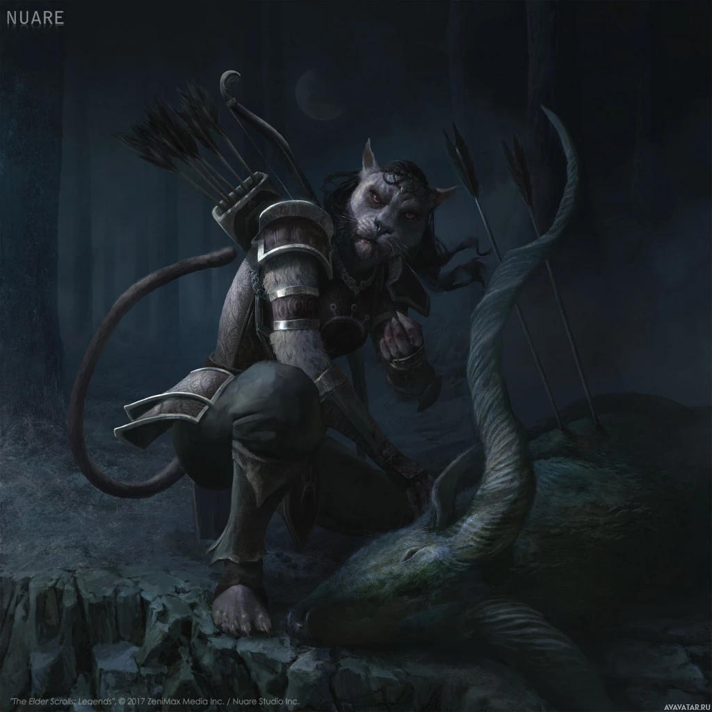 the video game "The Elder Scrolls," known as the Khajiit. This creature is anthropomorphic, with feline features such as ears and tails. It's wearing armor and holding a bow, suggesting that it may be involved in combat or hunting activities within the game. The character is posed in what appears to be a forest setting at nighttime, indicated by the dark surroundings and