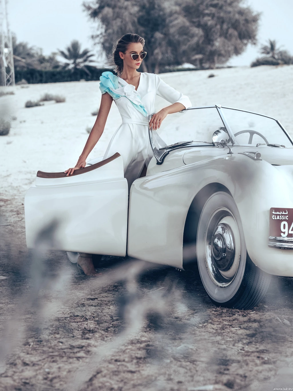a white dress that has some blue accents and she is accessorized with sunglasses and possibly a headscarf or hair accessory. The setting looks like a desert environment, as indicated by the sandy ground around the vehicle and