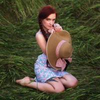 На картинке изображена девушка с рыжими волосами в цветочном платье. Она стоит на коленях в траве, держа в руках шляпу. Обстановка выглядит как поле на открытом воздухе или луг, возможно, в солнечный день, учитывая яркость фотографии.