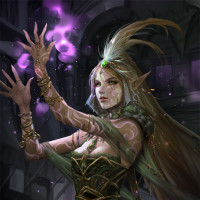 various mythologies and games. She stands amidst a backdrop that looks like a mystical or enchanted forest, with purple mists and what could be magical energy swirling around her hand as she makes a gesture with it. The overall impression is one of magic and otherworldly beauty.