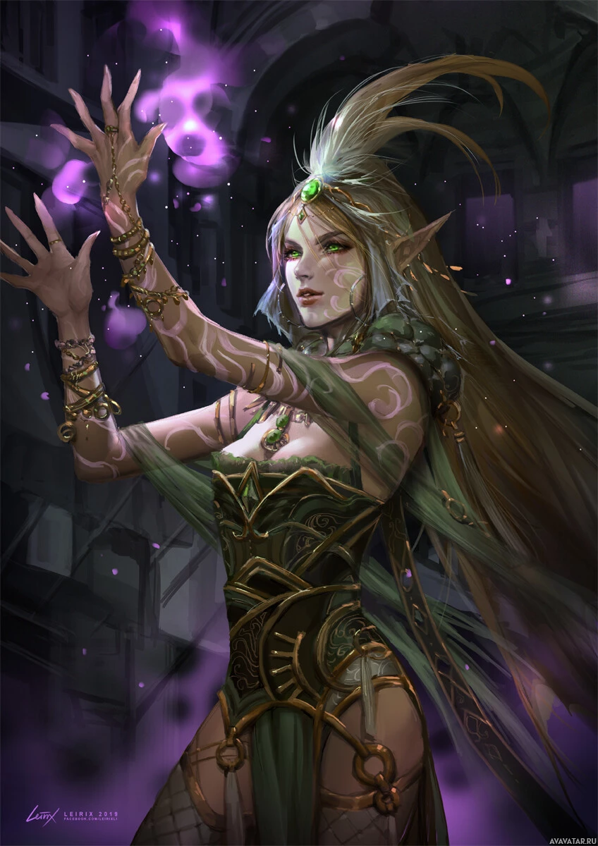a fantasy elf character. She is adorned in