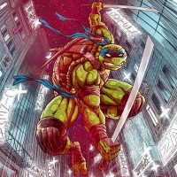 The image shows a stylized illustration of Leonardo, one of the Teenage Mutant