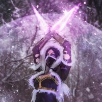 cosplay attire, resembling the Templar Assassin from the game Dota 2. They are outdoors with snow falling around them, which adds to the atmosphere of the scene. The cosplayer is holding what appears to be a staff or weapon in their right hand and has purple