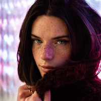 a young woman with brunette hair, blue eyes, and distinctive freckles across her face. She has a short haircut and is wearing