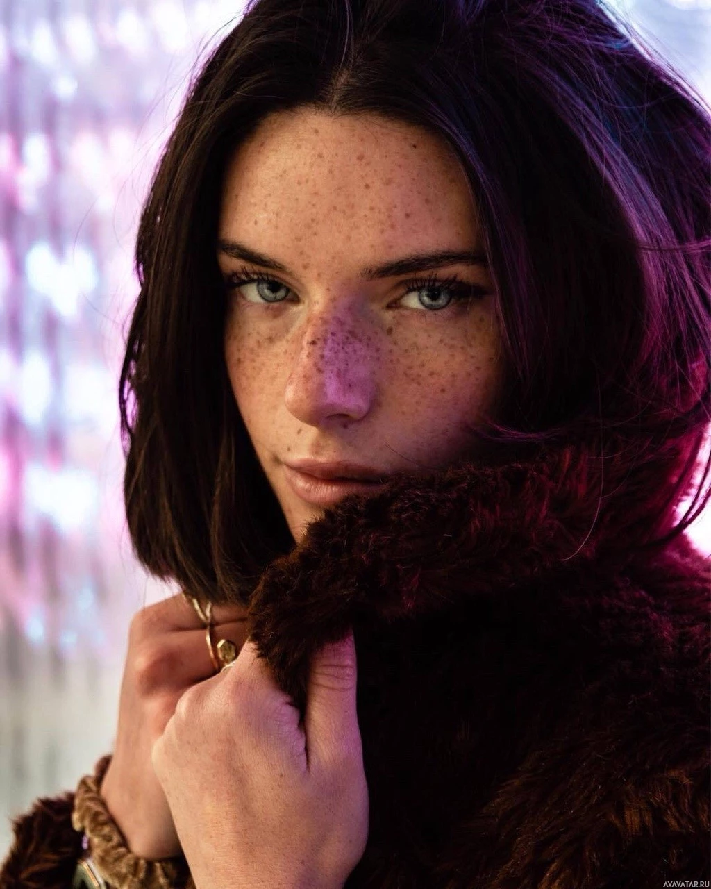 a fur coat with the collar up, partially obscuring her neck. The background appears to be