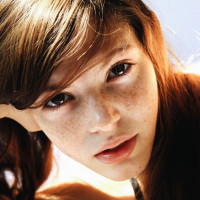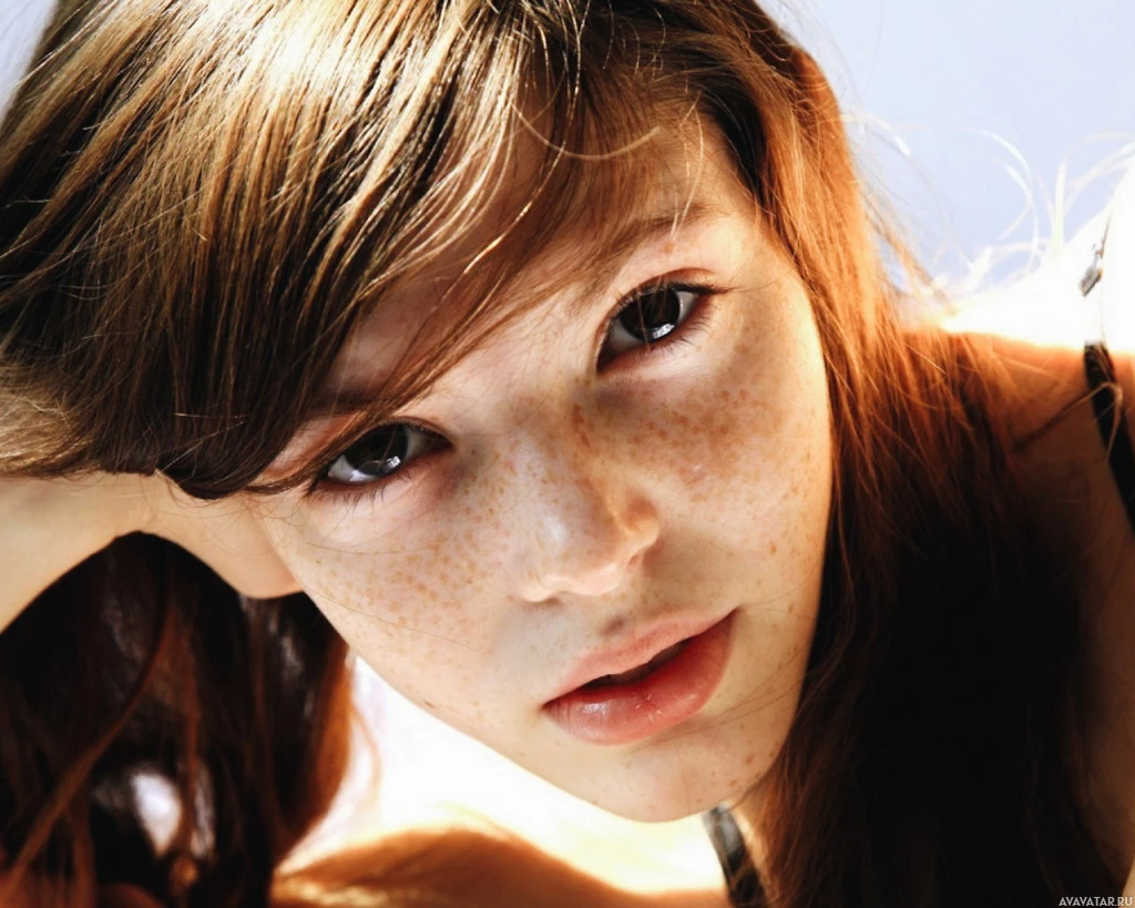 a young woman with freckles on her skin, and she has a relaxed expression. Her gaze is directed off to the side, and her lips are slightly parted as if she's in a state of calm or thoughtfulness. The image seems to emphasize the eyes, possibly indicating an artistic choice to highlight the emotional content through