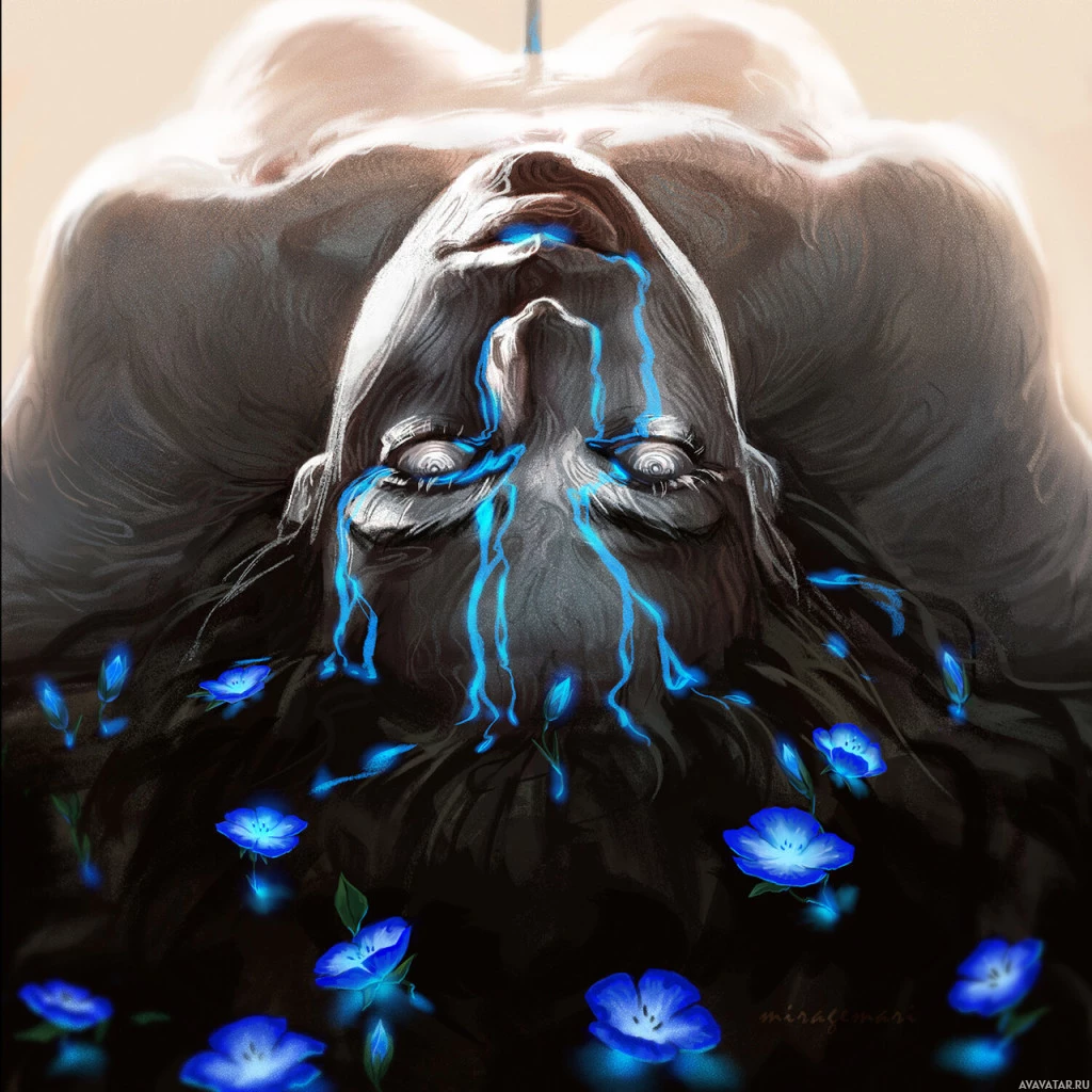 blue flowers that appear to be sprouting from her head and neck, giving the impression of a delicate yet painful transformation. This artwork can be described as fantasy-themed due to its unusual elements and surreal nature.