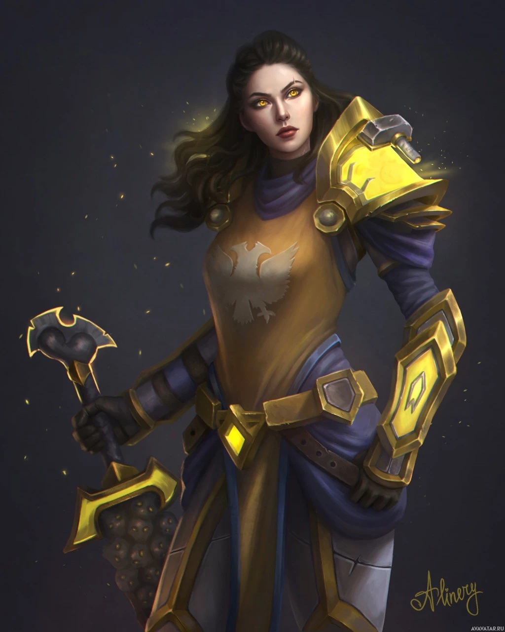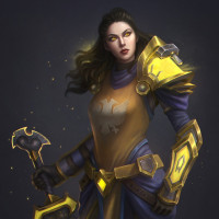 brown hair and is wearing armor consisting of a yellow breastplate with a crest on the chest and blue arm guards. In her right hand, she holds a shield with an emblem that appears to be a stylized dragon's head. In her left hand, she is holding