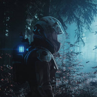 На снимке изображен робот-гуманоид, одетый как астронавт, стоящий в лесу ночью. Окружающая среда туманна, и освещение предполагает, что она может быть от низкой луны или тусклого лунного света, способствуя таинственной атмосфере. Наличие усаженной деревьями дорожки и листвы вокруг фигуры создает впечатление, что сцена происходит глубоко в лесу.