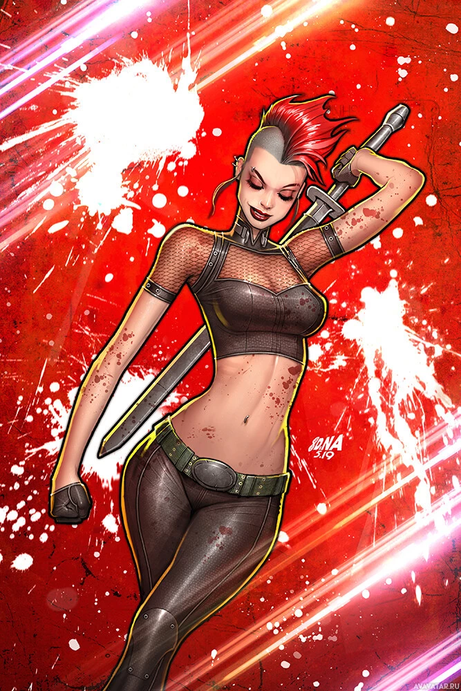 a female character with red hair, wearing what appears to be a leather or protective outfit. She has a sword attached to her side and is holding