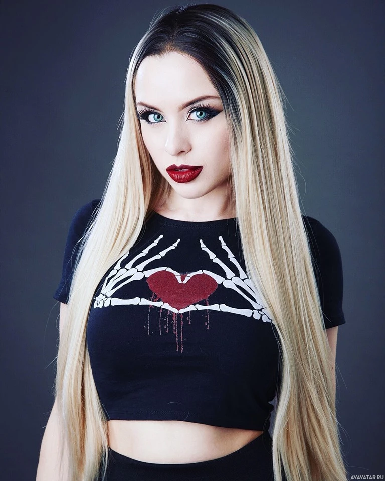 blonde hair and is wearing makeup that includes dark lipstick and dramatic eyeliner. They are dressed in