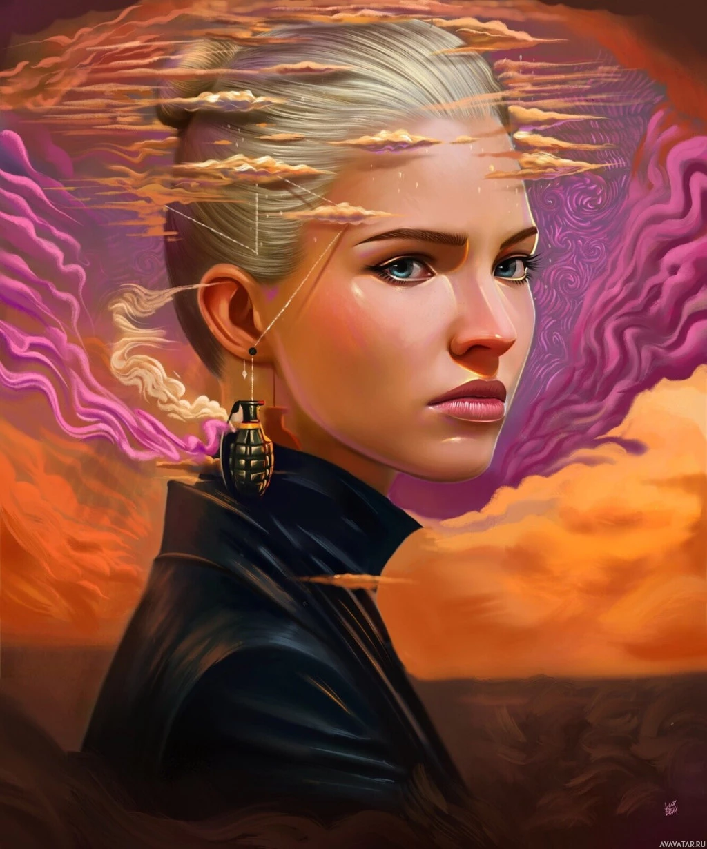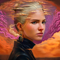 blue eyes and is wearing black clothing, which could suggest a sense of style or mood conveyed through her attire. There are also abstract elements in the background, such as swirling patterns that add a dreamlike or artistic quality to the image. The overall composition appears to blend realism with surreal or fantastical elements, creating an intriguing