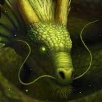 yellow scales and is depicted in a coiled position, reminiscent of a serpent. There are also glowing particles or magical effects surrounding the creature, enhancing