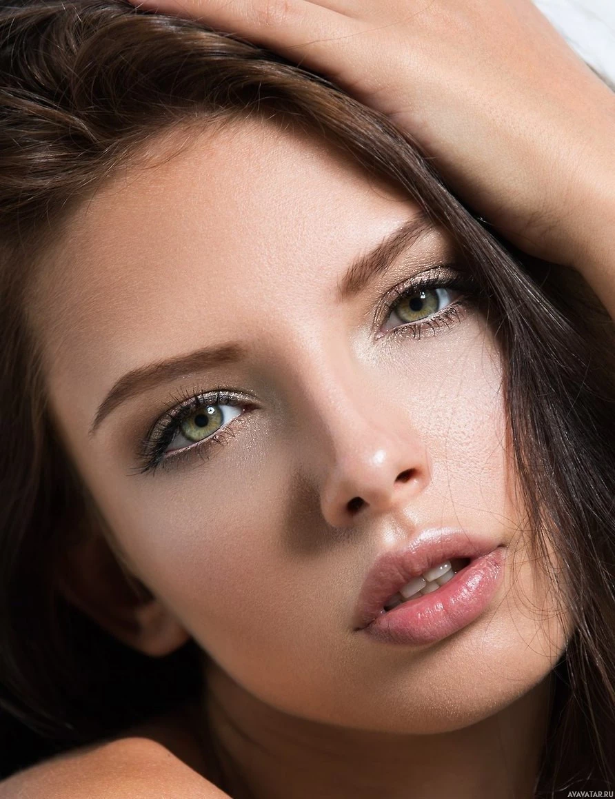 На картинке изображена женщина с макияжем крупным планом, возможно, в целях моделирования или рекламы. У нее длинные волосы и поразительные глаза, и ее кожа, кажется, хорошо поддерживается. Ее рука помещается на голову, давая ощущение расслабления или созерцания.