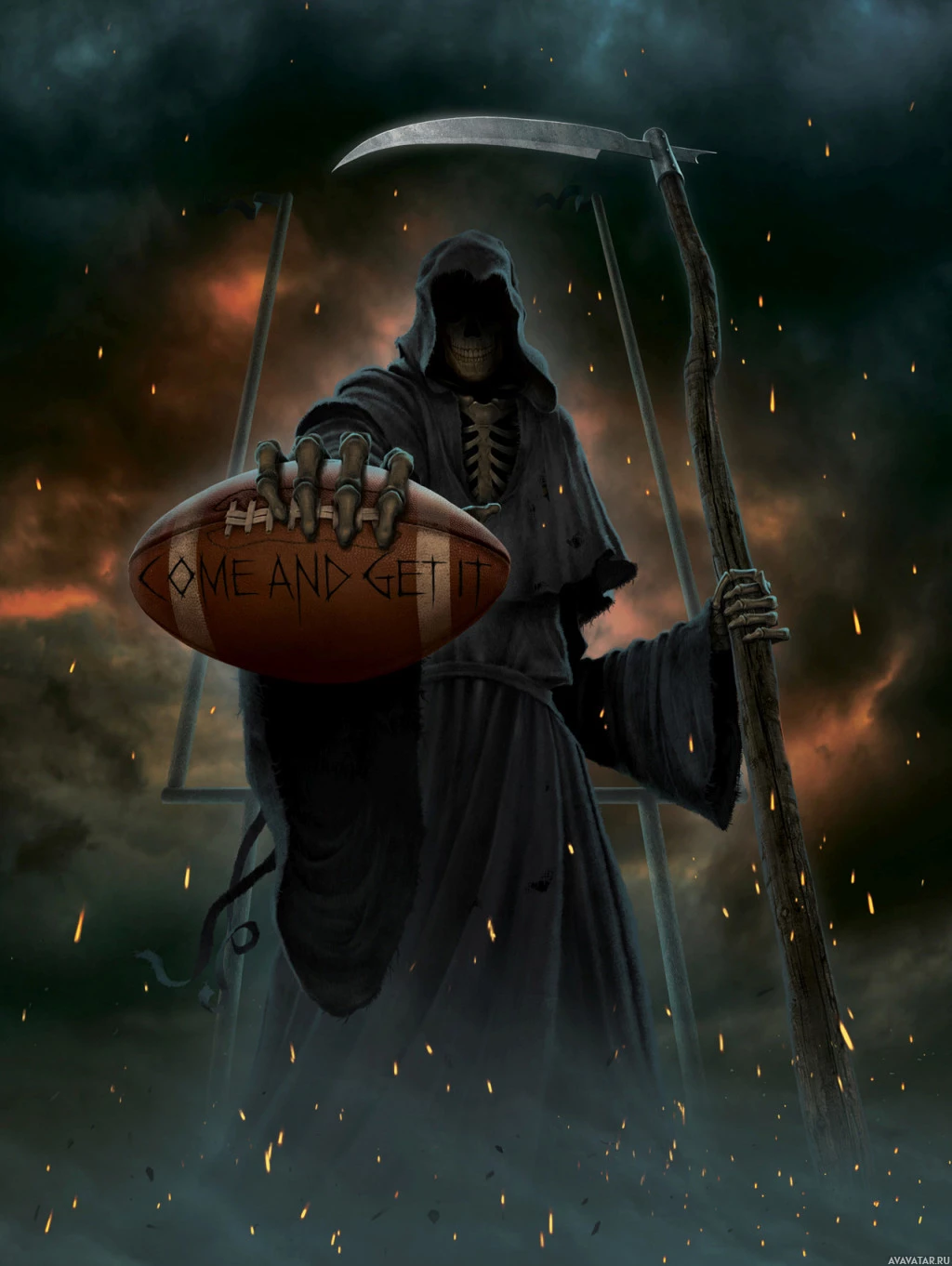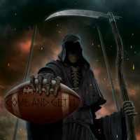 the Grim Reaper or Death, holding a football. The phrase "One life to live" is written on the football, suggesting themes of mortality and the preciousness of life within the context of sports or competition. The character is often referred to as the "Football Reaper" due to its connection with both death and the sport of football. This image could be used in various contexts, such as a piece of art,