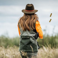 outdoor activities. They are holding a gun and looking into the distance, suggesting they might be preparing to shoot or have just shot at something. The setting is