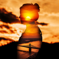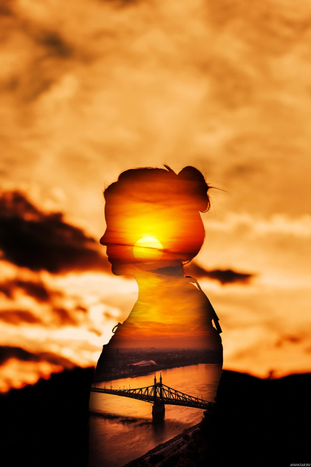 a silhouette of a woman standing in front of a scenic view, possibly at sunrise or sunset given the warm colors in the sky. The background includes what appears to be a river with a bridge spanning across it, suggesting a peaceful and picturesque location that might be