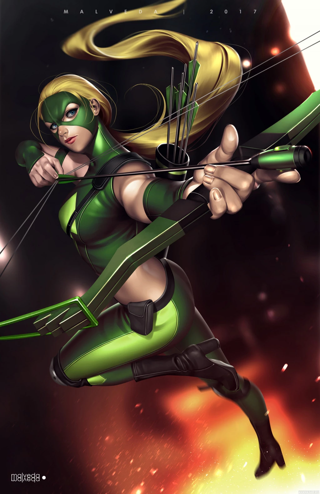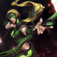 blonde hair. She is dressed in a green and black costume that resembles the attire of Arrow from
