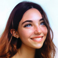 light hair, possibly with highlights of different shades to create depth or dimension in the image. Her makeup is done in a natural style that accentuates her facial features without being overly dramatic. The overall vibe of the image seems to be cheerful and relaxed, showcasing