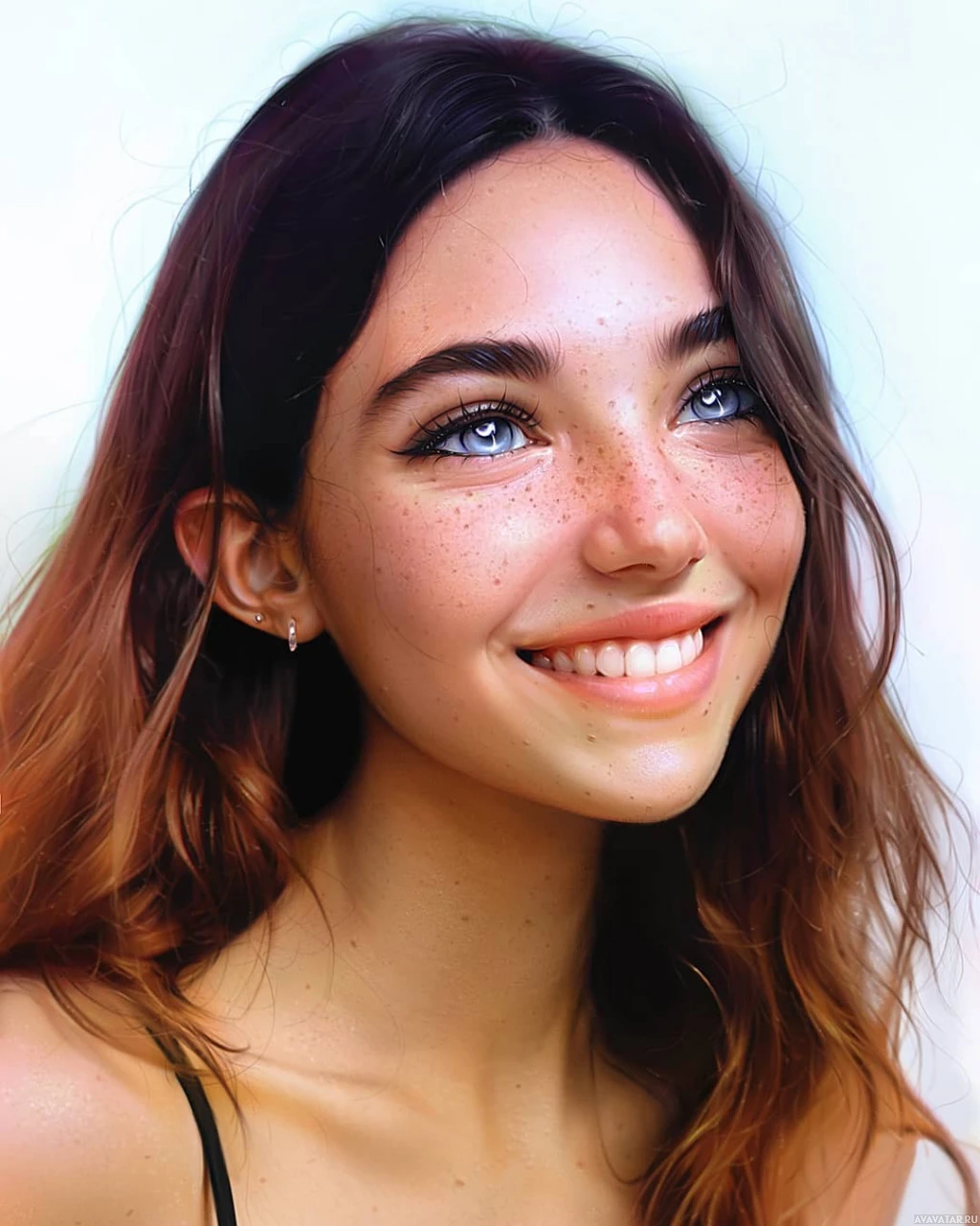 a young woman with freckles on her face and a gentle smile. She has