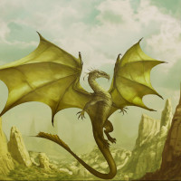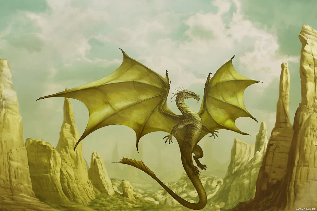 a fantasy dragon in mid-flight. The dragon has large wings and is surrounded by rock formations that suggest