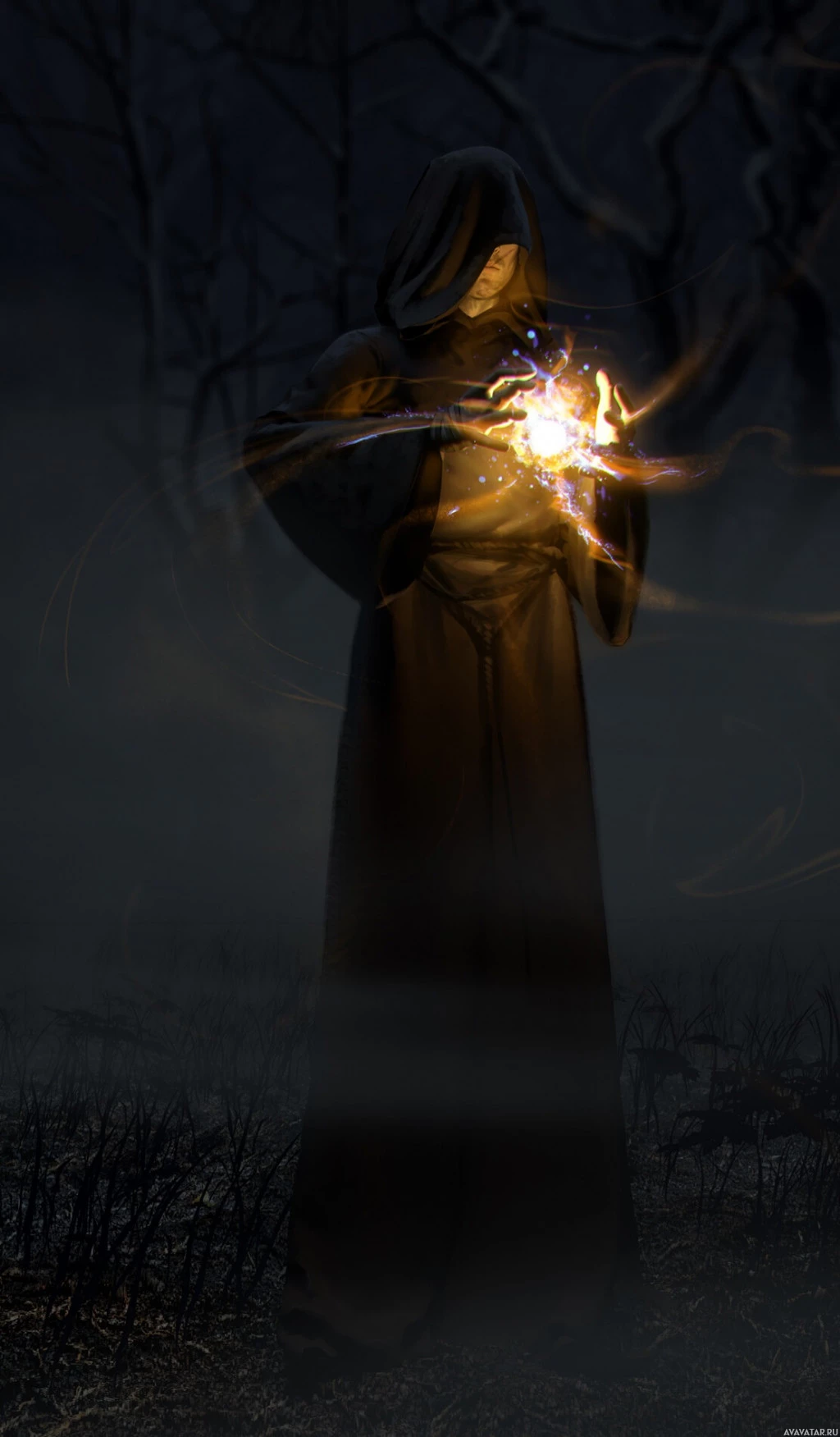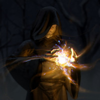medieval attire, including a long cloak and hooded robe, which suggests they might be from a time period when such clothing was common for those involved in mystical practices. The character's face is hidden behind the cowl of the robe, adding to their mysterious appearance. They are holding what appears to be a glowing object or wand, possibly used for