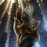 fantasy creature is perched atop what appears to be a rock or pillar amidst dark, cloudy skies, giving it an otherworldly appearance. The artwork has a dramatic and possibly ominous tone, with the griffon looking somewhat contemplative or stern. The genre of this image falls under