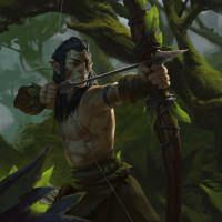 long hair, wearing what appears to be traditional or fantasy-style attire, possibly consisting of leather and fur elements. The elf is aiming a bow at a target, suggesting
