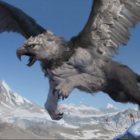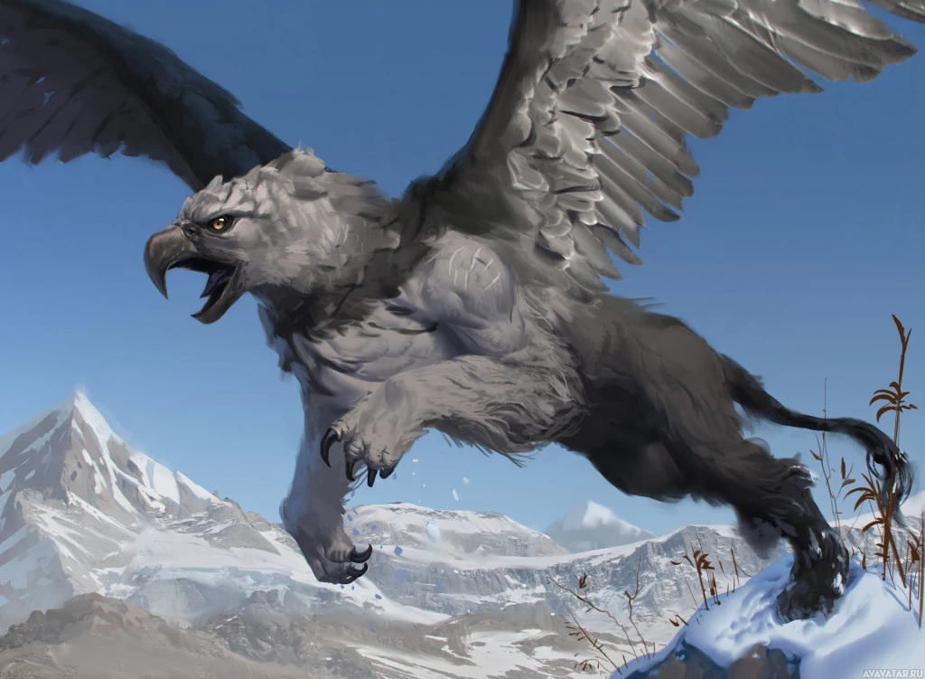 На картинке изображено фантастическое существо, известное как грифон, которое изображено с телом льва и головой орла. Грифон кажется величественным и мощным, парящим по горному ландшафту, запыленному снегом.