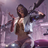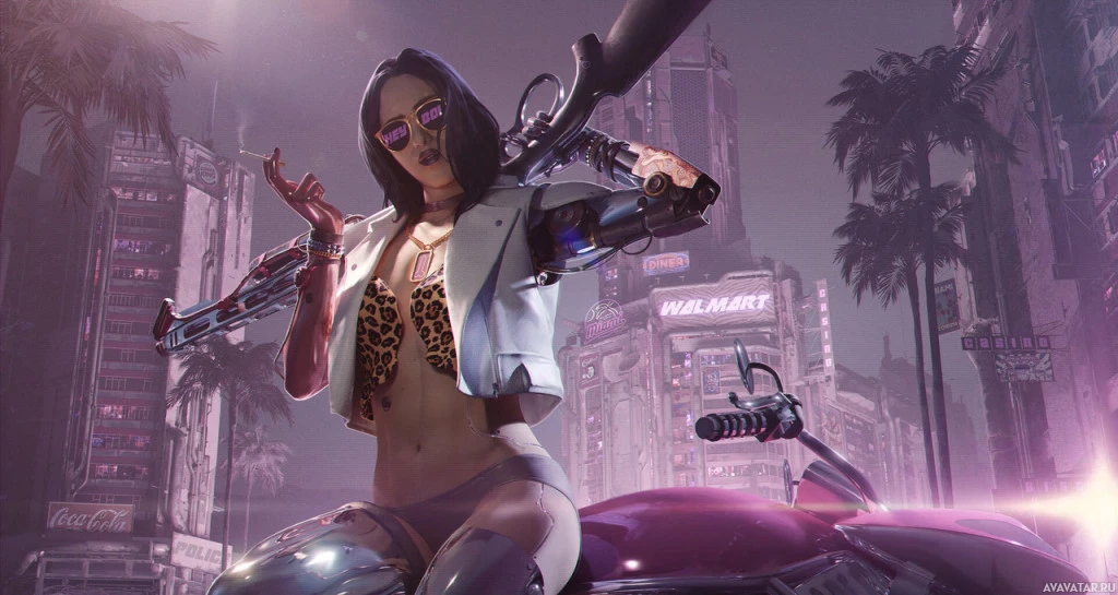 a female character from the video game "Cyberpunk 2077." She is holding a gun, which suggests that she might be engaged in combat or preparing for battle. Her attire and accessories indicate a cyberpunk theme, which is consistent with the game's setting. The background depicts a neon-lit