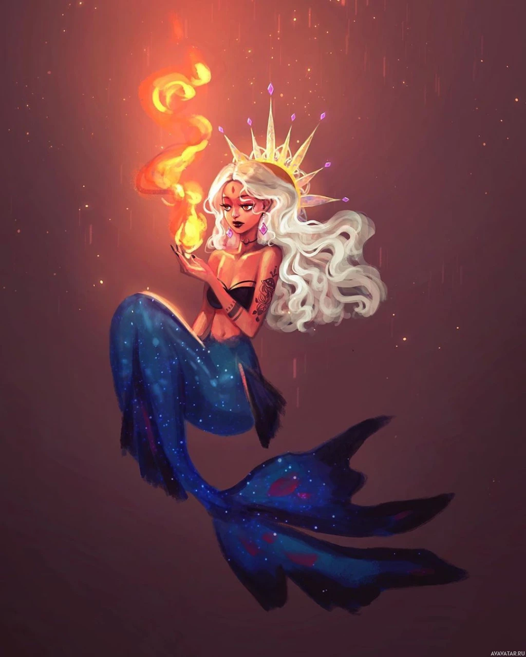 white hair, sitting on the ground and holding what appears to be a fire or flame in her hand. She is depicted with fish-like fins instead of legs and is wearing a tiara. The background is dark and moody, which contrasts with