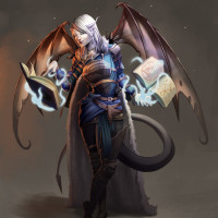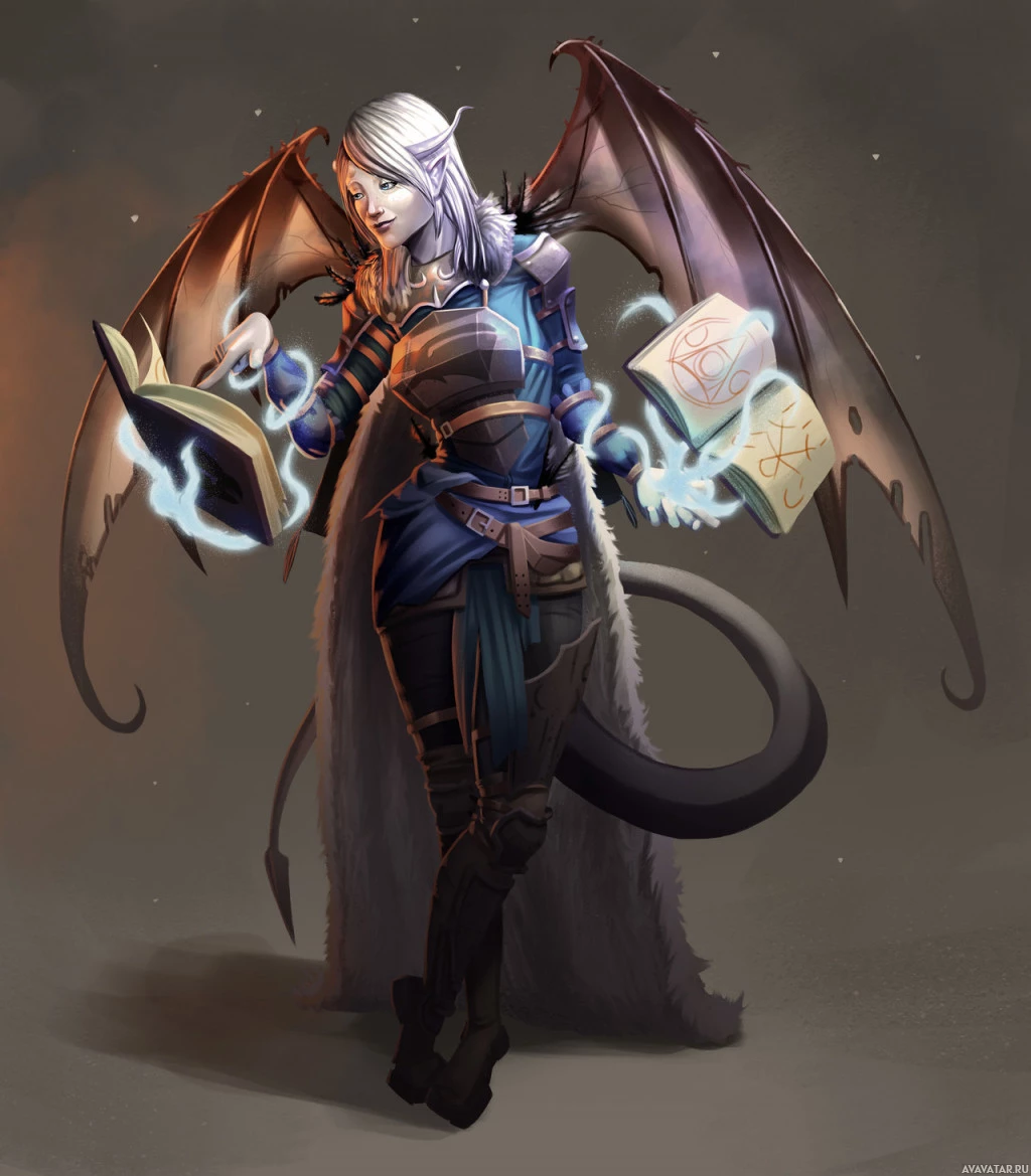 The image depicts a fantasy illustration of an individual with the features of a succubus. This character has wings and is adorned with what appears to be magical or mystical symbols, suggesting