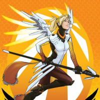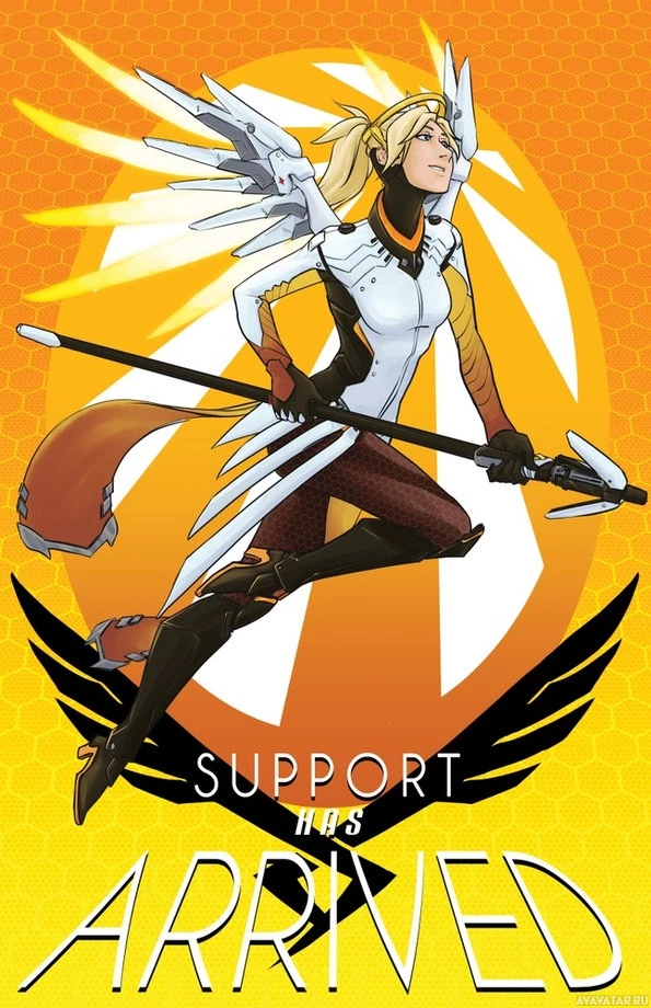 default pose, where she seems to be either jumping or floating. The artwork includes her wings and staff, which are part of her unique design as a healer with angelic powers within