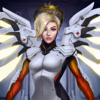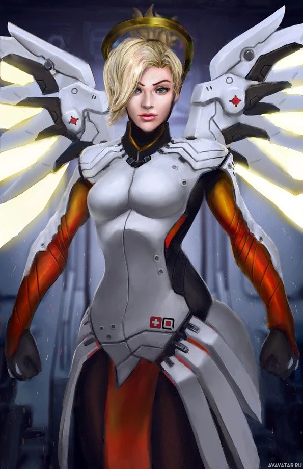 The image depicts a character known as Mercy from the video game Overwatch. She is portrayed in her angelic form, complete with wings and armor. This character is often associated with healing abilities within the game.
