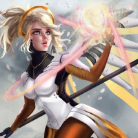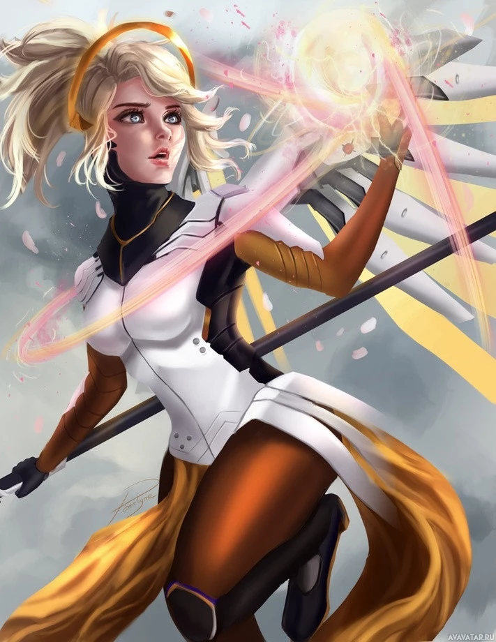 На картинке изображен персонаж из видеоигры «Overwatch». Это Милосердие, герой поддержки, известный своими целебными способностями и способностью воскрешать товарищей по команде. Она показана в середине действия с энергетическими лучами, исходящими из ее рук, когда она заклинает.