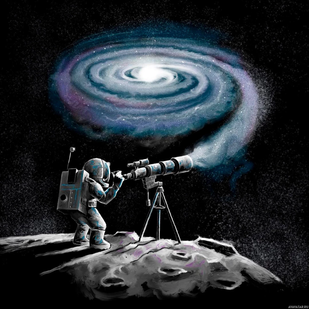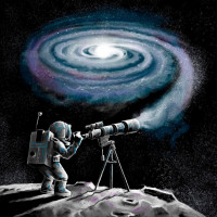 The image shows an astronaut looking through a telescope while standing on the surface of what appears to be the moon. The background features a colorful galaxy with stars and nebulae, suggesting that this is a representation of