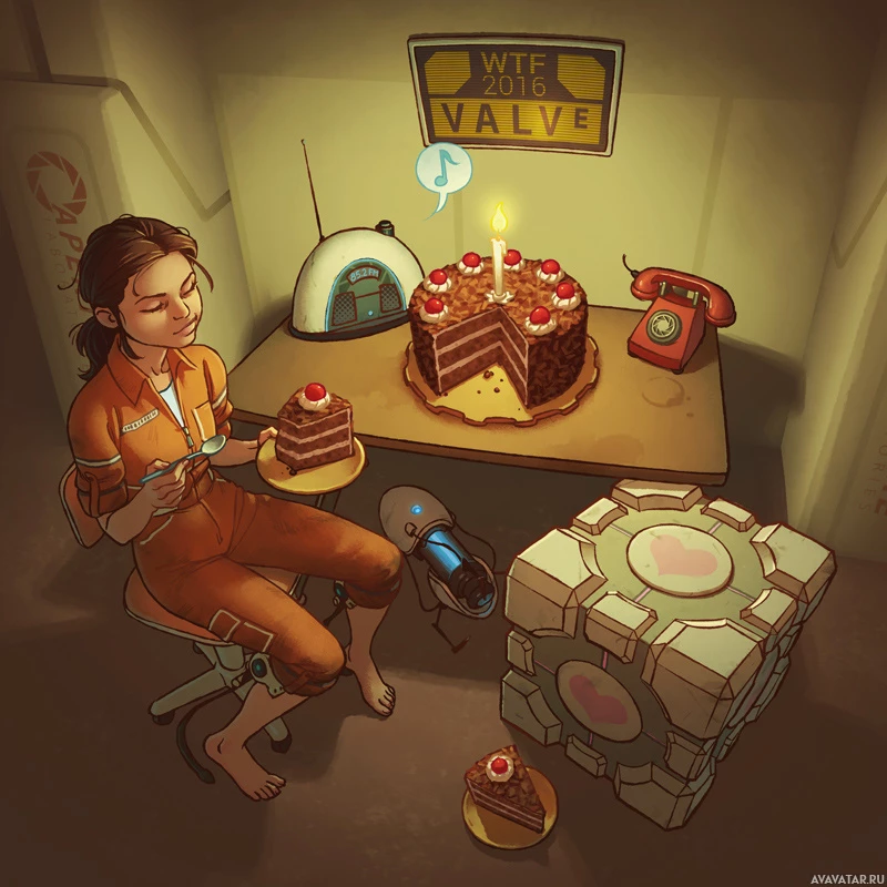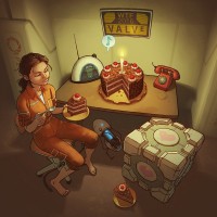 video games, such as the game series "Portal." To the right of the person is a glowing blue cube with a symbol on it, possibly representing an in-game item or a prop commonly associated with science fiction settings. The overall scene suggests a blend of reality and fictional elements, possibly from a video game setting that incorporates real-life elements like a birthday celebration in the midst of work activities.