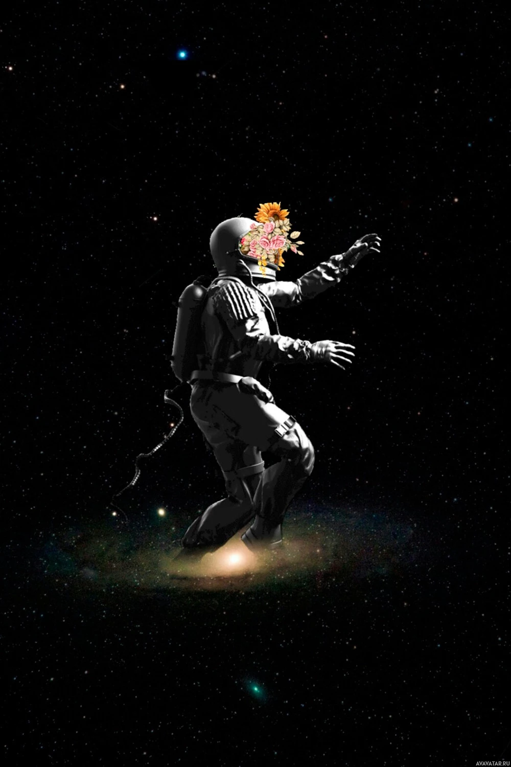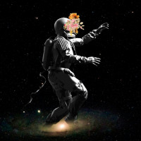 a celestial body, such as the moon or Mars, given the starry space background. The astronaut is wearing a spacesuit and has one arm raised in a waving gesture towards an object that resembles a flower with multiple petals and