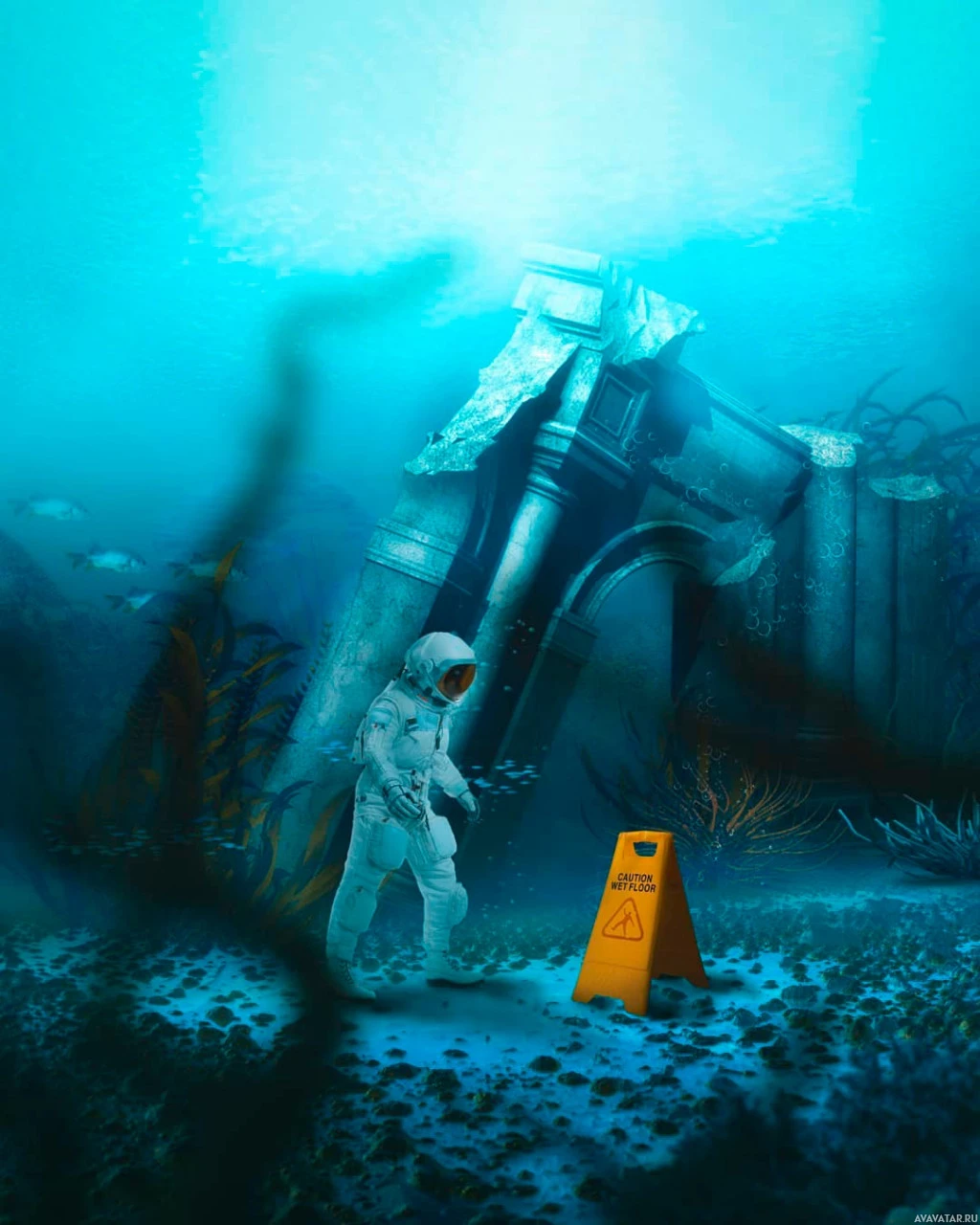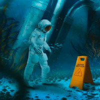 The image depicts an astronaut on the ocean floor, surrounded by
