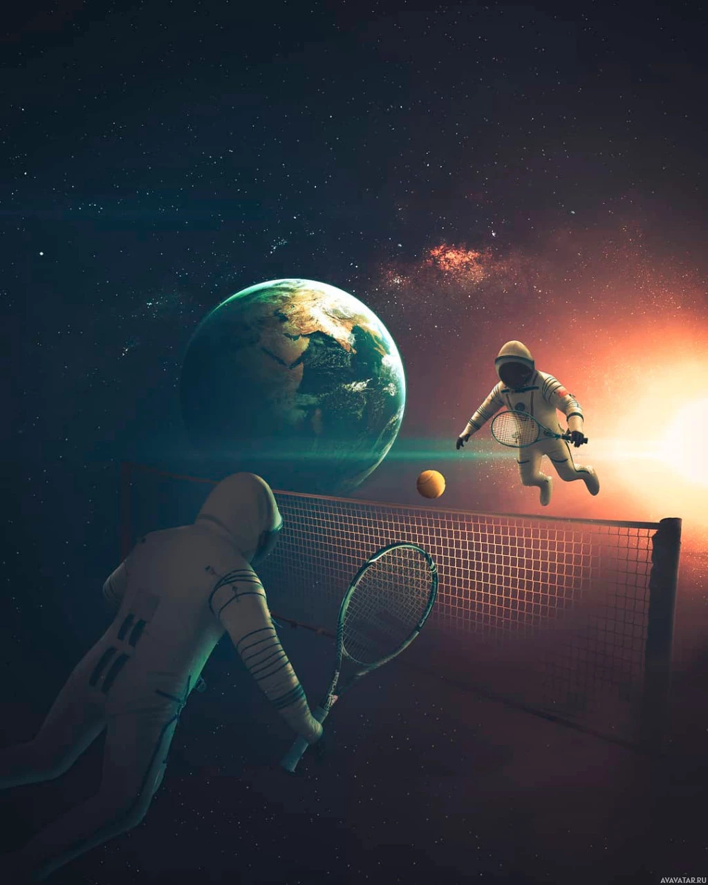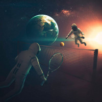 a tennis racquet as if they are preparing to serve or return a ball. On the right side of the image, there is another astronaut who appears to be flying towards