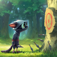 trees in the background, and there's a target visible on one of the tree trunks, suggesting that the cat might be engaging in some sort of training or exercise. The artwork has a whimsical and playful quality, blending elements from