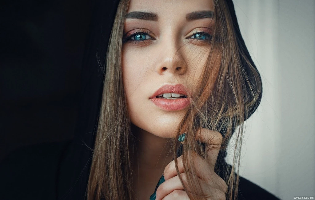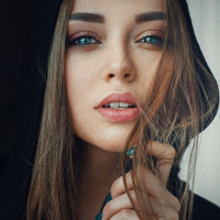 a dark top or jacket, and there's a hood visible near her shoulder, suggesting it might be part of her clothing. The background is blurred but seems to have a warm tone, possibly indoor lighting that casts