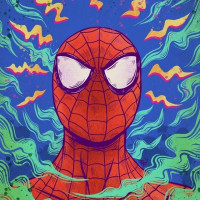 iconic costume, which includes the spider emblem on his chest, and he is shown with his characteristic spider-like web pattern in the background. The use of