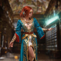 a video game or fantasy setting. This character is dressed in what appears to be armor with blue and gold accents, suggesting she might be a warrior or mage of some sort. She has