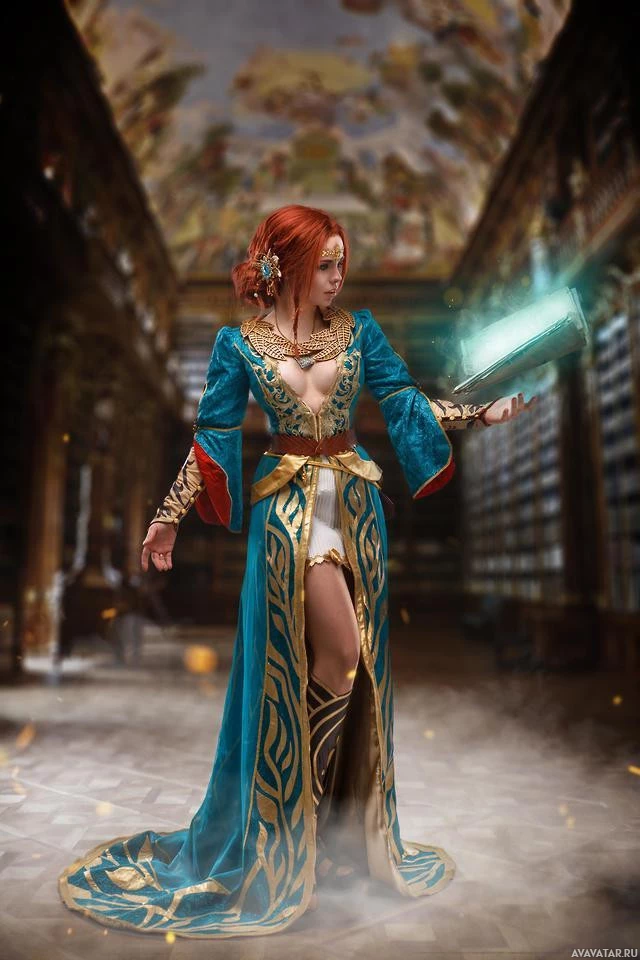 red hair styled up with what looks like an accessory or headpiece adorned on the left side of her head. The setting around her seems to be a library or a room filled with books and architectural details that indicate an ancient or medieval design. There is also a glowing, magical-looking object in her right hand, which could signify some sort of magic or spellcasting ability within the context of this character's storyline. The overall feel of the image is one of fantasy and possibly adventure or exploration.
