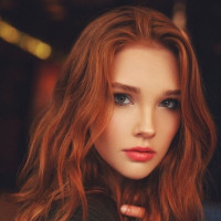 a young woman with red hair. She has an elegant and poised expression on her face, looking directly at the camera. The lighting in the photo creates