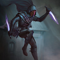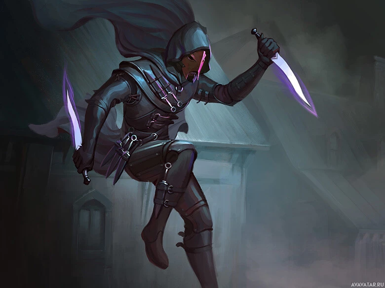 Картинка показывает фантастического персонажа в плаще с капюшоном, держащего пару фиолетовых мечей. Они, кажется, находятся в движении, возможно, прыгая или бегая с выражением намерения на лице. Сцена выглядит как средневековая или готическая среда, предполагая, что сцена может быть из игры, комикса или фэнтезийного искусства.