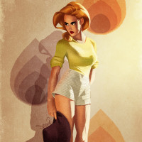 The image features an illustration of a woman who appears to be a stylized, animated character. She has red hair and is wearing a yellow top with shorts or a skirt. She is also holding what looks like a hat in her hand. The background suggests a vintage or retro setting with warm tones.