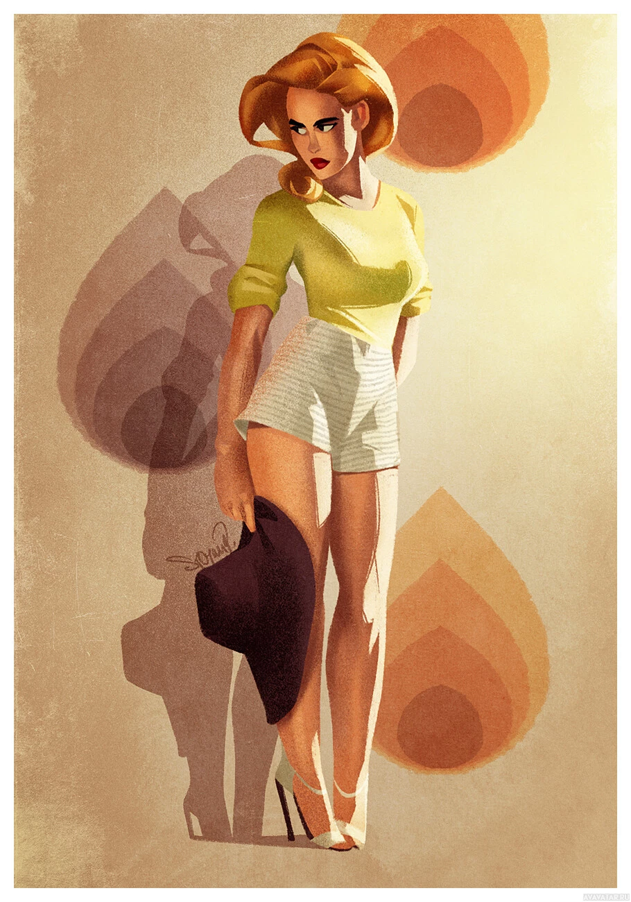 На картинке изображена женщина, которая кажется стилизованным, анимированным персонажем. Она имеет рыжие волосы и носит желтый верх с шортами или юбкой. Она также держит в руке то, что выглядит как шляпа. Фон предполагает винтажную или ретро-настройку с теплыми тонами.